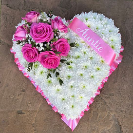 This beautiful closed heart is based with white Chrysanths and a layette of Roses and foliage. It is personalised with a sash ribbon with vinyl lettering.