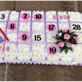 This tribute has a ribbon edging and is based in white chrysanths. On the right hand page, numberous letters are spray painted in two different colours. (In this case MUM and NAN are in pink)